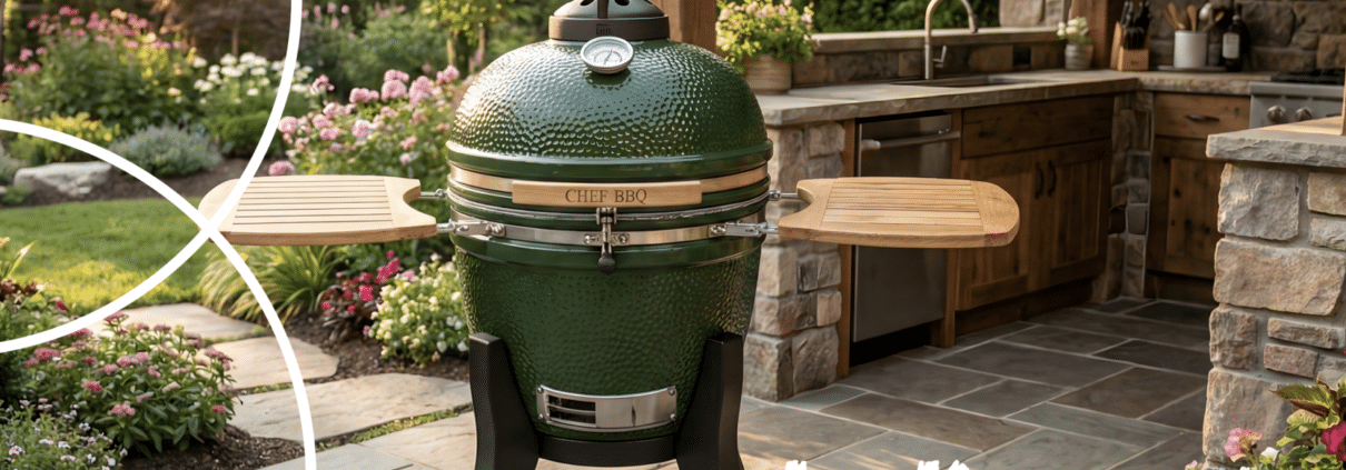 • L'Étoilé, barbecue de la marque Kamado - visuel devant une cuisine extérieure d'un jardin fleuri